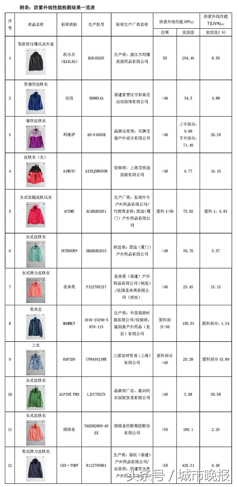2. 湛江市瑪雅旅游用品有限公司生產(chǎn)的凱樂石(KAILAS)男款旅行薄風(fēng)衣外套(生產(chǎn)批號:KG610263),其UPF檢測值為294.46;