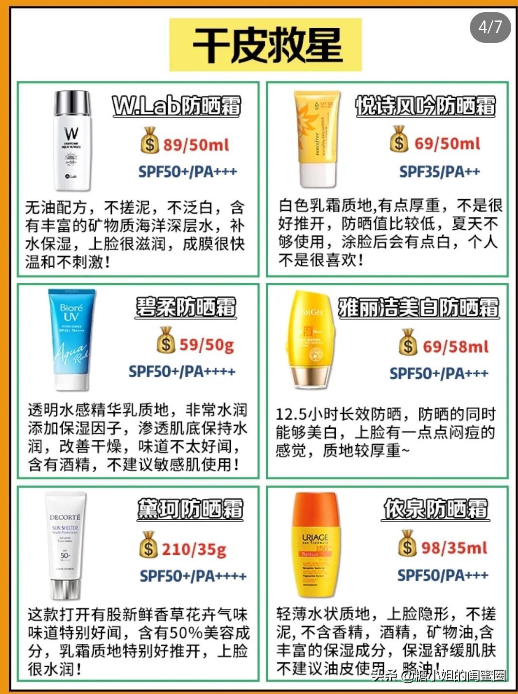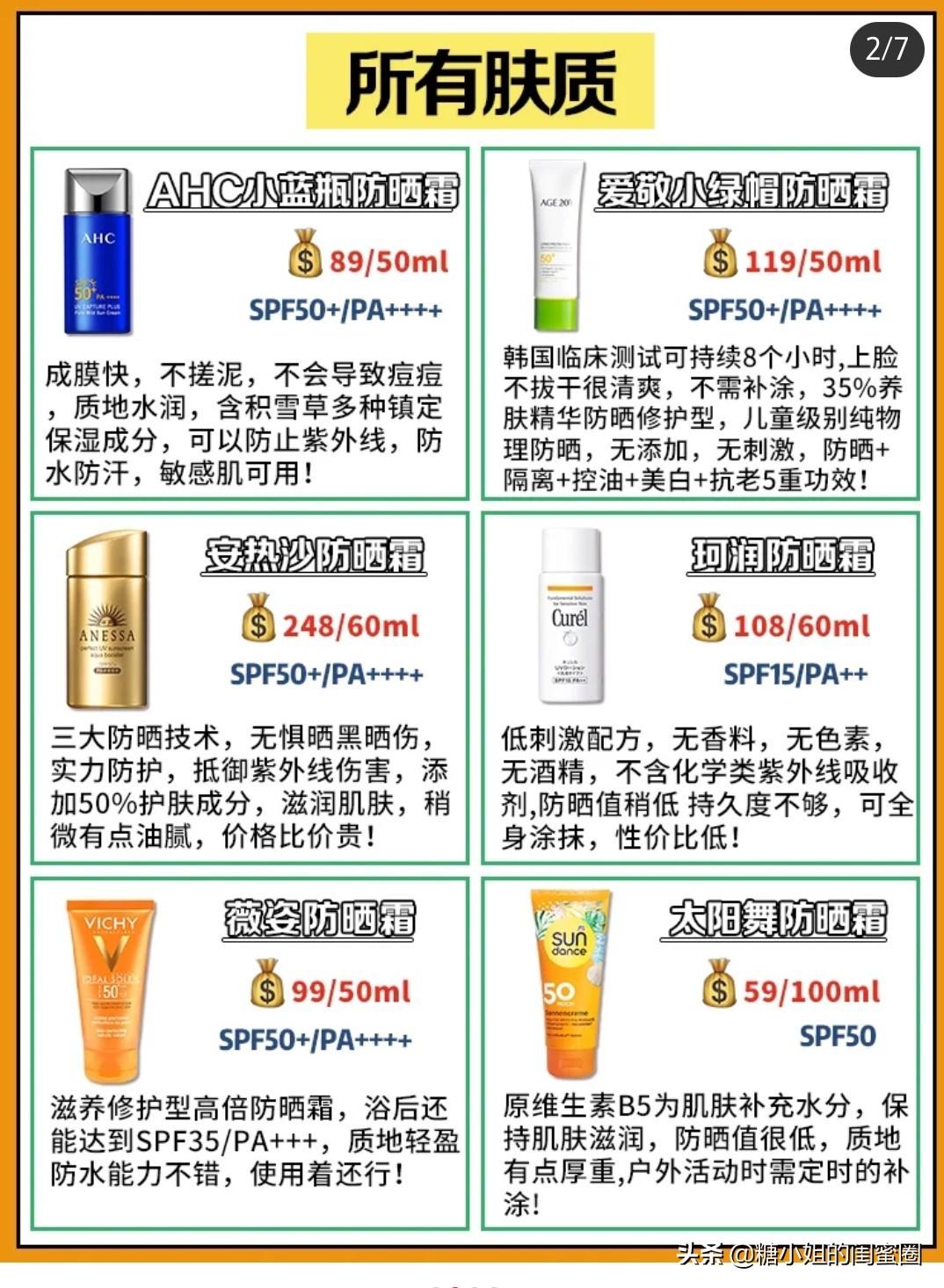 適合所有膚質(zhì)的這6款防曬霜,小編主推3款,一是AHC家的小藍(lán)瓶,價(jià)格美麗而且使用感很nice~不油不悶,二是安耐曬,不知道選什么防曬安耐曬總是沒(méi)錯(cuò)的,防曬能力超強(qiáng),就是個(gè)別膚質(zhì)敏感的小仙女會(huì)悶痘哦,三是薇姿的防曬,法國(guó)藥妝成分安心。