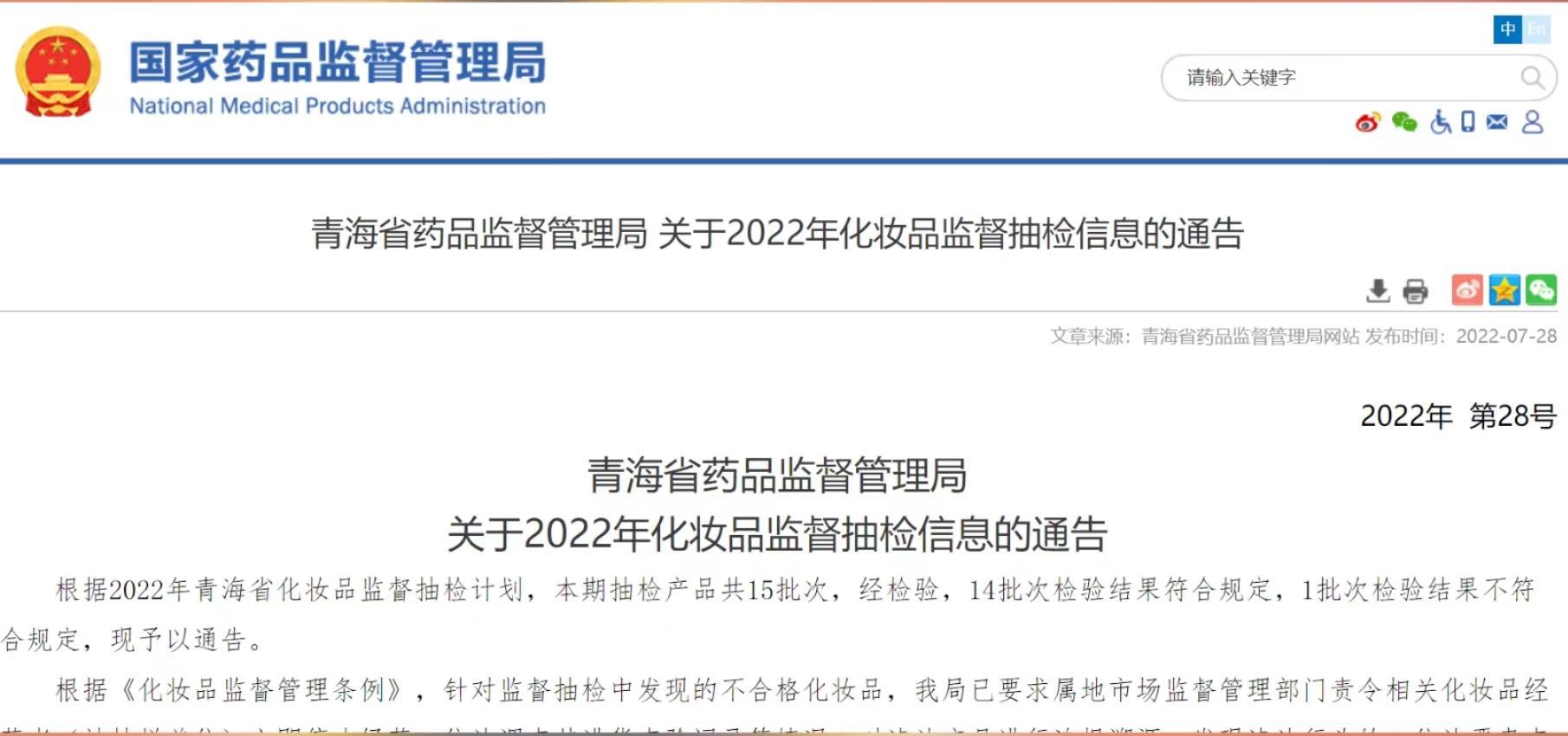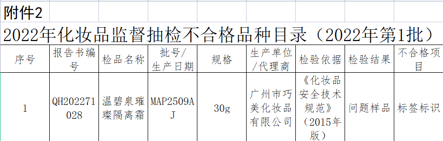 根據(jù)2022年青海省化妝品監(jiān)督抽檢計劃,本期抽檢產(chǎn)品共15批次,經(jīng)檢驗,14批次檢驗結(jié)果符合規(guī)定,1批次檢驗結(jié)果不符合規(guī)定,為廣州市巧美化妝品有限公司生產(chǎn)的溫碧泉璀璨隔離霜,涉標簽標識項目不合格。