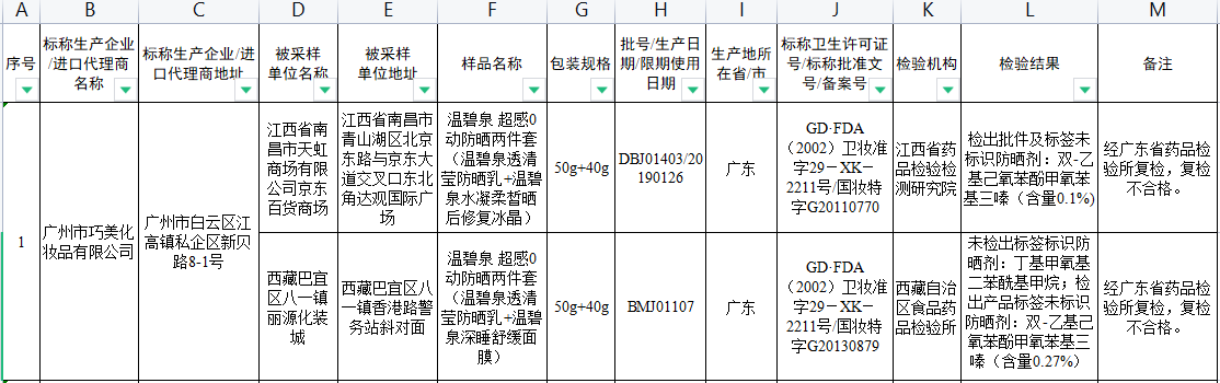 2016年,在食品藥品監(jiān)督管理總局在全國范圍組織開展的化妝品監(jiān)督抽檢中,廣州市巧美化妝品有限公司生產(chǎn)的溫碧泉 超感0動防曬兩件套(溫碧泉透清瑩防曬乳+溫碧泉水凝柔皙曬后修復冰晶)被檢出批件及標簽未標識防曬劑:雙-乙基己氧苯酚甲氧苯基三嗪(含量0.1%);溫碧泉 超感0動防曬兩件套(溫碧泉透清瑩防曬乳+溫碧泉深睡舒緩面膜)未檢出標簽標識防曬劑:丁基甲氧基二苯酰基甲烷;檢出產(chǎn)品標簽未標識防曬劑:雙-乙基己氧苯酚甲氧苯基三嗪(含量0.27%),兩款產(chǎn)品經(jīng)廣東省藥品檢驗所復檢,均復檢不合格。