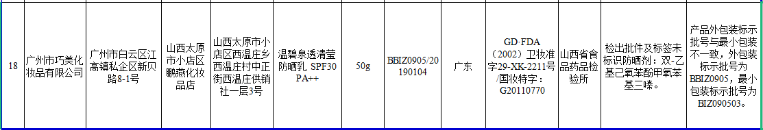 2017年,廣州市巧美化妝品有限公司生產(chǎn)溫碧泉透清瑩防曬乳 SPF30 PA++經(jīng)山西省食品藥品檢驗所檢驗,檢出批件及標簽未標識防曬劑:雙-乙基己氧苯酚甲氧苯基三嗪;產(chǎn)品外包裝標示批號與小包裝不一致,外包裝標示批號為BBIZ0905,小包裝標示批號為BIZ090503