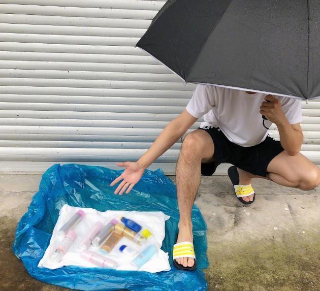 照片中,許魏洲身穿白T黑短褲配休閑拖鞋,他撐著一把遮陽傘并擋住臉部,蹲在攤位前給大家展示各式各樣的防曬霜,搞怪十足。這些防曬霜真的有可能是他自己的,網(wǎng)友調侃:“攤主露臉可能價格可以賣高一點!”