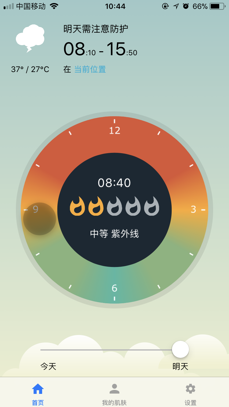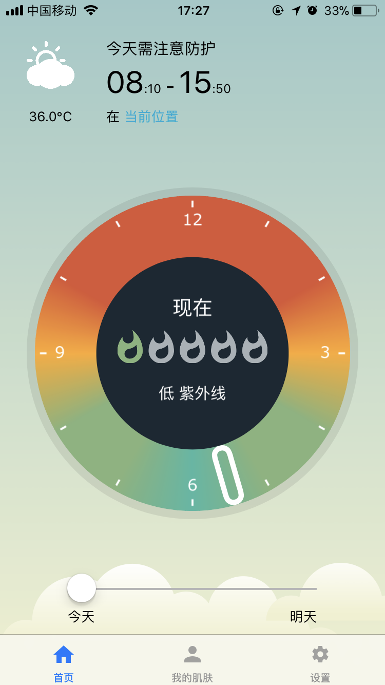 貼心的紫外線防護提示確定好位置之后,應用就會給出當天的天氣、溫度、即時紫外線,并給出需注意防護的時間段。