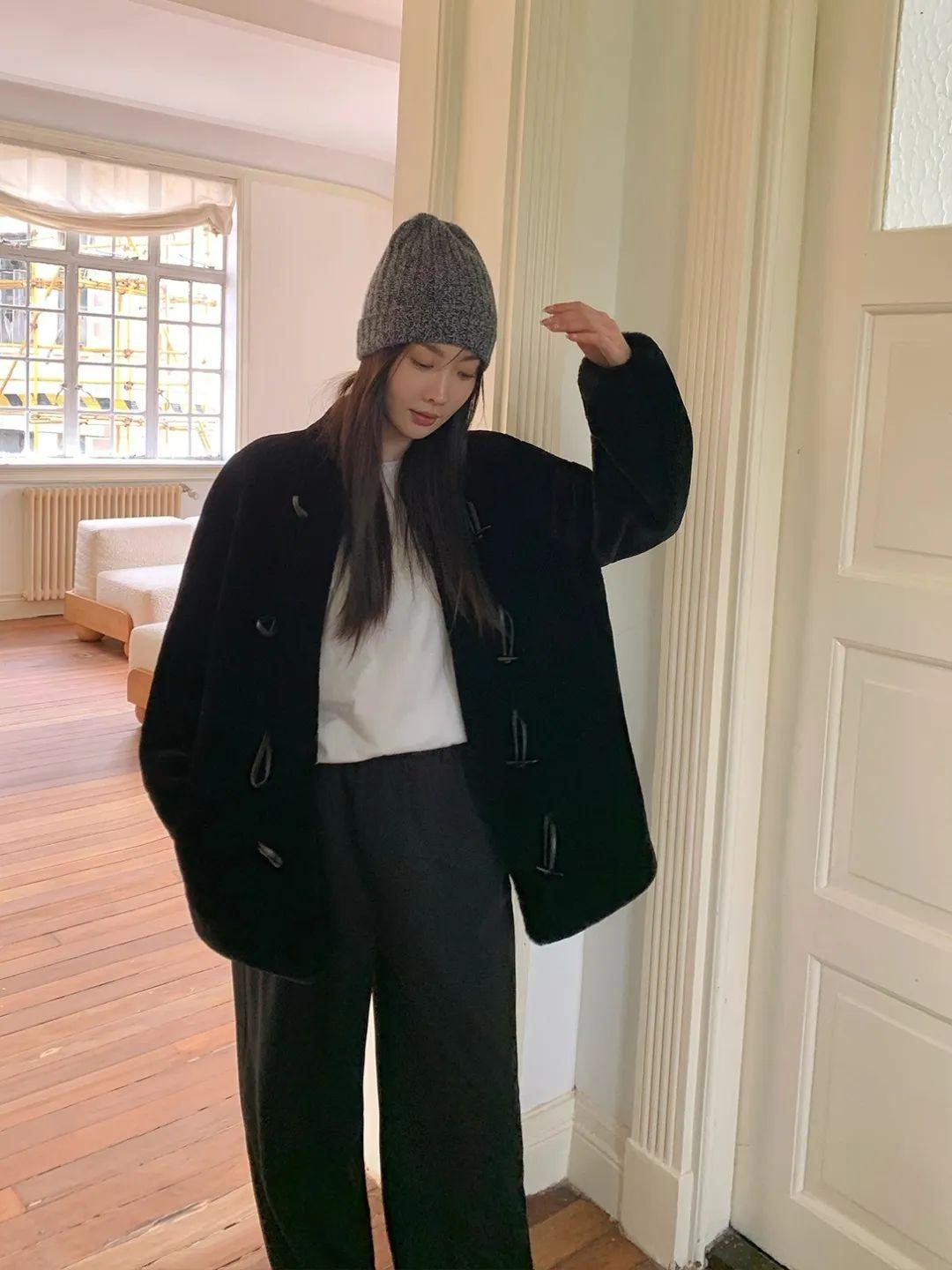 FireladyFur這件皮草外套手感好,黑色也很高級(jí),V領(lǐng)牛角扣的設(shè)計(jì)不會(huì)老氣,外套版型很寬松,里面穿毛衣也沒有問題。