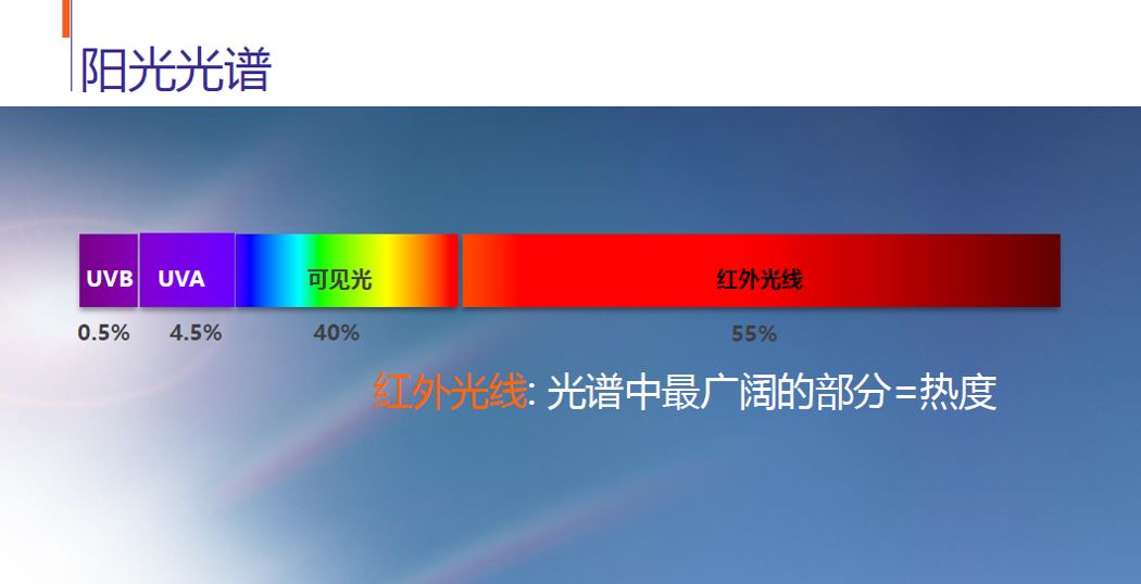 一般來(lái)說(shuō),太陽(yáng)光線中不僅包含了40%的可見(jiàn)光(尤其是電腦手機(jī)輻射的藍(lán)光)和55%的紅外線光,還有4.5%的UVA和0.5%的UVB,紅外線光是整個(gè)光譜中廣闊的部分,也是熱度的來(lái)源,所以它在防曬工作里的地位就顯得尤為重要。