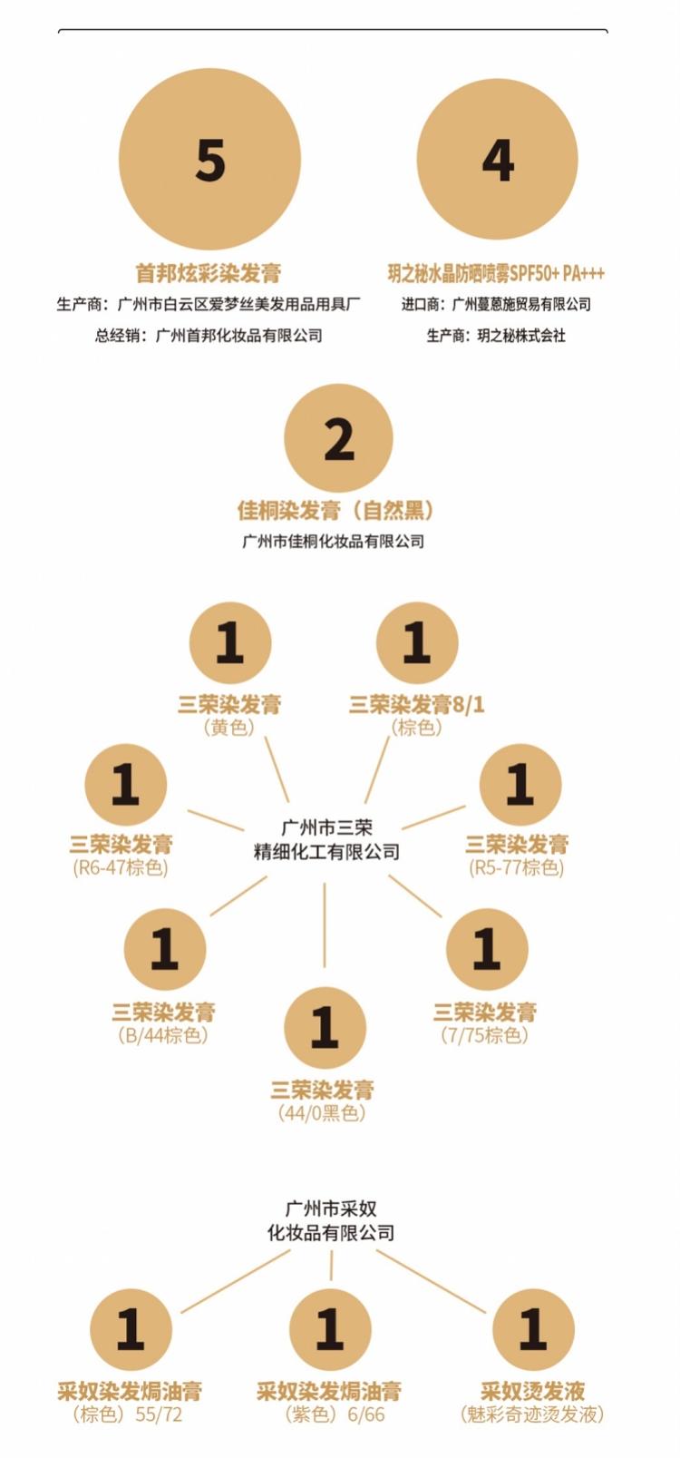 上述假冒化妝品中,36批次為染發(fā)膏,占比超七成。主要包括:標(biāo)示廣州楚顏化妝品有限公司生產(chǎn)的“楚顏專業(yè)染發(fā)焗油膏棕色(巧克力色)”、“楚顏專業(yè)染發(fā)焗油膏(黑色)‘’;標(biāo)示廣州市漢邦化妝品有限公司生產(chǎn)的“昌義漢邦染發(fā)膏(自然黑色)”、”漢邦染發(fā)膏(咖啡色5.75)“;標(biāo)示廣州市采奴化妝品有限公司生產(chǎn)的“采奴染發(fā)焗油膏(棕色)55/72“、”采奴染發(fā)焗油膏(紫色)6/66”;還有標(biāo)示廣州市三榮精細(xì)化工有限公司生產(chǎn)的7批次三榮染發(fā)膏,分別為黃色、8/1棕色、R6-47棕色、R5-77棕色、B/44棕色、7/75棕色、44/0黑色;標(biāo)示“生產(chǎn)商:廣州市白云區(qū)愛夢(mèng)絲美發(fā)用品用具廠,總經(jīng)銷:廣州首邦化妝品有限公司“的5批次首邦炫彩染發(fā)膏(自然黑、板栗色);標(biāo)示廣州市佳桐化妝品有限公司生產(chǎn)的2批次佳桐染發(fā)膏(自然黑)等。