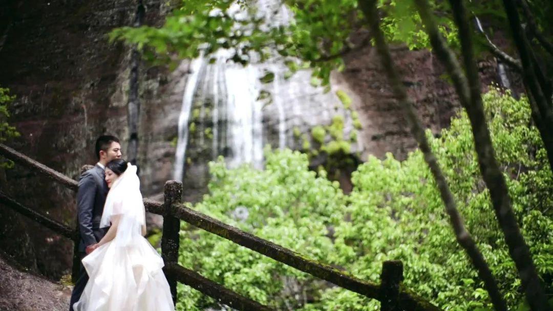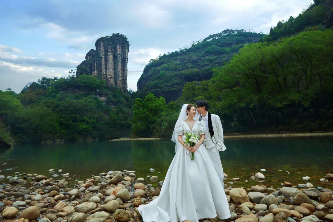 青山綠水與浪漫婚紗的碰撞,山水一程,有幸相逢,以愛之名擁抱武夷山水,溪邊輕柔的風揚起著你的頭紗,還有我們的笑容。