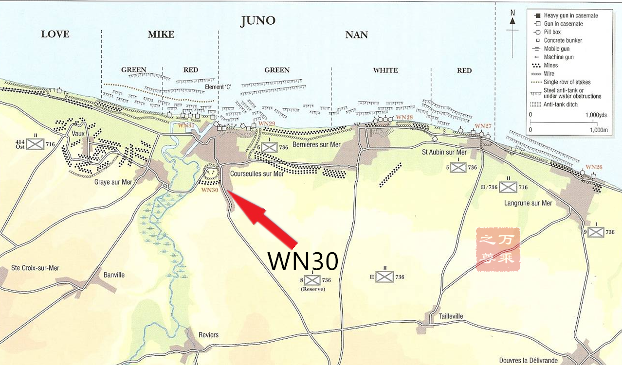朱諾海灘的初步轟炸并沒有像預(yù)期的那樣有效,只有14%的預(yù)定目標(biāo)失去了作用。然而朱諾海灘西側(cè)的掩體被海軍炮火摧毀,加拿大步兵第三師第7旅登陸時(shí)沒有受到攻擊,盡管如此,德國人的火力很猛,在一支五艘登陸艇的艦隊(duì)中,有四艘被迫擊炮、障礙物和障礙物上的地雷擊沉或嚴(yán)重?fù)p壞。WN30山上。一場激烈的逐家逐戶的戰(zhàn)斗持續(xù)了整個(gè)上午,后在中午時(shí)分包圍并占領(lǐng)了WN30。在朱諾海灘的東側(cè),加拿大旅在來自WN27據(jù)點(diǎn)的火力下登陸在濱海小鎮(zhèn)圣奧賓。這個(gè)區(qū)域的海堤很高,有時(shí)超過3.6米。村子里有效的防御措施是在海堤的非標(biāo)準(zhǔn)掩體中安裝一門50毫米大炮,幾輛坦克在上岸后迅速地被接連擊倒,這個(gè)掩體持續(xù)戰(zhàn)斗了3個(gè)多小時(shí),直到大約1115小時(shí)左右被來自陸地一側(cè)的步兵攻擊。48名英國突擊隊(duì)員在朗格魯恩附近的WN26前面上岸,上岸大約在9時(shí)左右進(jìn)行,當(dāng)時(shí)許多海上障礙物部分或完全淹沒在水下,對登陸艇造成了大面積破壞。