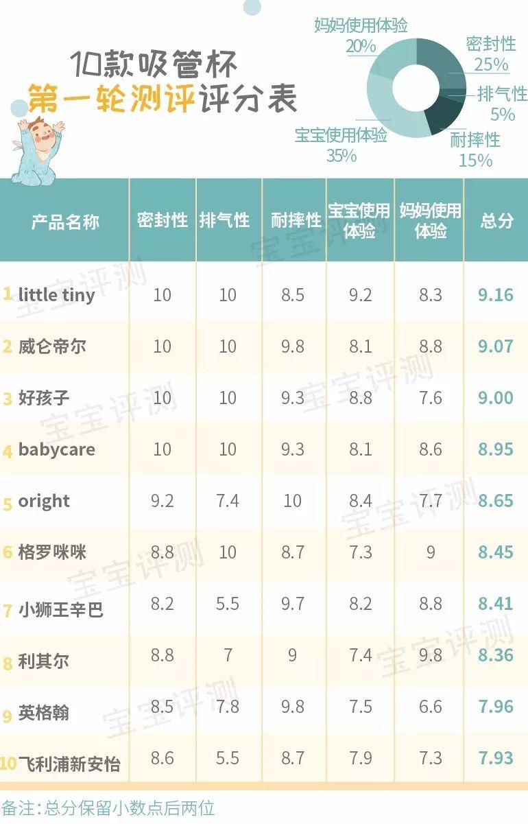 在密封性、排氣性、耐摔性、寶寶使用體驗、媽媽使用體驗等5項測評結(jié)束后,笨爸爸給不同的評測指標按重要程度進行權(quán)重劃分(具體權(quán)重見圖表),再經(jīng)過加權(quán)平均計算,10款吸管杯第一輪測評的總分及排名情況如下:
