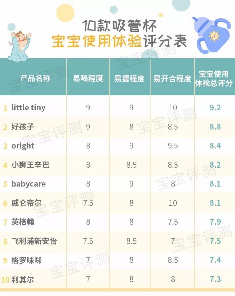 綜合3個項目的評測,10款吸管杯的寶寶使用體驗測評得分如下(滿分10分):
