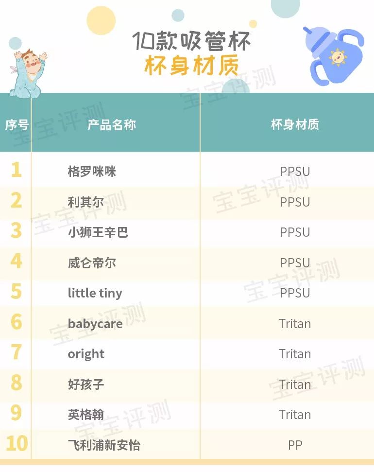 4、10款吸管杯中,5款為PPSU材質(zhì),4款為Tritan材質(zhì),1款為PP材質(zhì)。