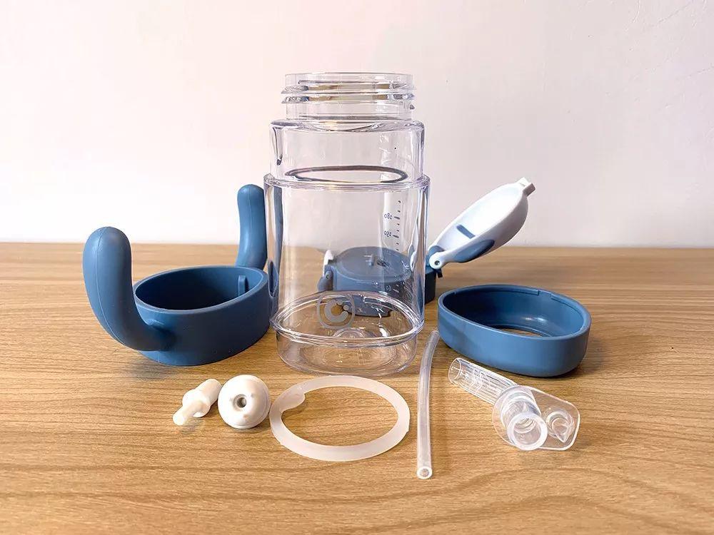 oright:安裝較復(fù)雜,重力球不易安裝;杯蓋及彈扣按鈕內(nèi)有縫隙,吸嘴呈彎曲狀,清洗可能不徹底;刻度線易讀程度中。