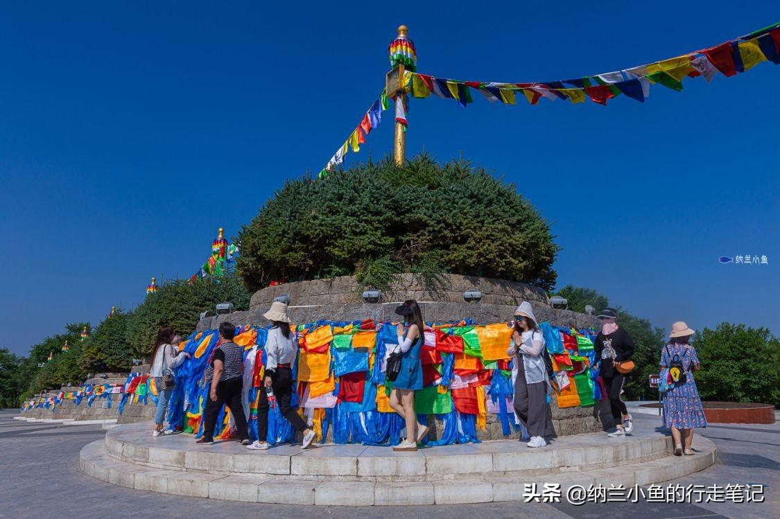 山頂平臺(tái)中央有十三個(gè)敖包呈“一”字形排列。敖包的漢語意思為“堆子”,即用石塊堆起來的圓錐形石堆,頂端插一根長(zhǎng)桿,四周有圍繩,圍繩上系滿了哈達(dá)和經(jīng)幡。一派濃郁的藏傳氛圍,三五成群的人在默默地轉(zhuǎn)敖包。