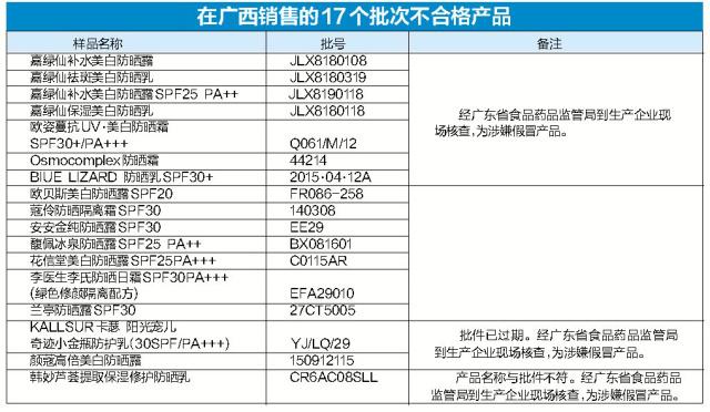 在廣西抽檢到的17批次不合格產(chǎn)品中,標(biāo)稱為“嘉綠仙補(bǔ)水美白防曬露”、“嘉綠仙祛斑美白防曬乳”等4批次產(chǎn)品,分別在南寧市佳吉生物科技有限公司和南寧葛玄堂商貿(mào)有限公司銷售,未檢出批件和標(biāo)簽中標(biāo)示的防曬劑,經(jīng)食品藥品監(jiān)管部門核查,為涉嫌假冒產(chǎn)品。