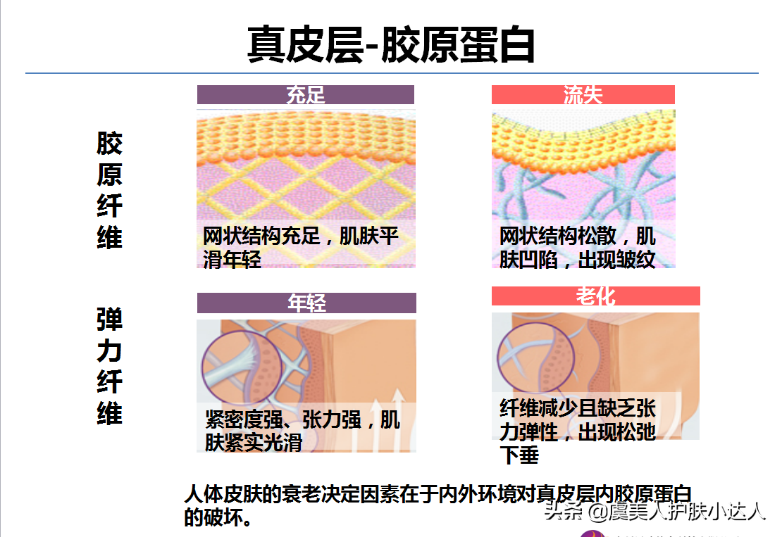 人體皮膚的衰老決定因素在于內(nèi)外環(huán)境對層內(nèi)膠原蛋白的破壞。隨著時間的流失,皮膚膠原蛋白會慢慢的流失,肌膚會出現(xiàn)凹陷,出現(xiàn)皺紋,出現(xiàn)松弛下垂。
