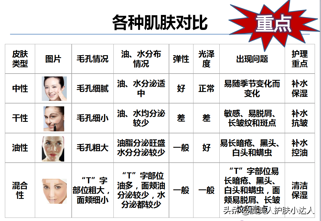 皮膚按其皮脂腺的分泌狀況,一般可分為四種類型:中性、干性、油性、混合性。