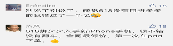 低價(jià)格吸引了眾多買家,有買家就表示"自從用上了拼多多天天都是購(gòu)物節(jié)"、"錯(cuò)過(guò)了拼多多的618就感覺錯(cuò)過(guò)了一個(gè)億"......這些買家們的話,道出了大多數(shù)參加了這次618大促的消費(fèi)者的心聲。