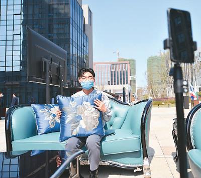 在江西省贛州市南康區(qū)跨境電商產(chǎn)業(yè)園,銷(xiāo)售員工通過(guò)手機(jī)直播的形式推銷(xiāo)家具。 新華社記者 胡晨歡攝