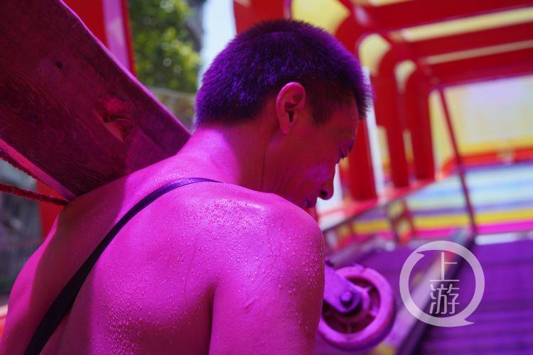 冉光輝古銅色的皮膚在陽光下發(fā)亮,健碩的胳膊,有力的步伐,和那根棒棒撐起了朝天門的夏天。在相對寬敞的上下坡,他背頂著貨,可以騰出雙手,僅靠著背力就扛起重物?!斑@個是我們‘棒棒’練就的基本功!可以讓雙手歇息一會兒?!彼v出手把糊住眼睛的汗水抹開。