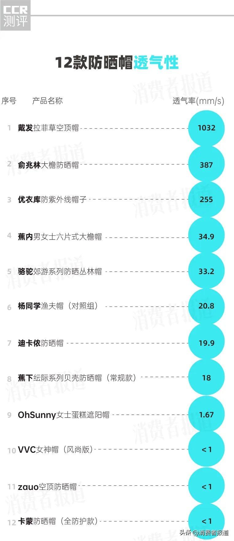 此次透氣性檢測方法依據(jù)GB/T 5453-1997《紡織品 織物透氣性的測定》,結(jié)果顯示,有微孔的草帽式防曬帽戴發(fā)透氣率佳,達1032mm/s,其次是俞兆林、優(yōu)衣庫,透氣率均超過200mm/s。