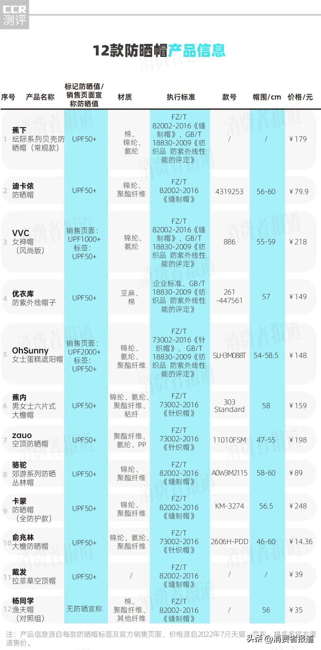 2022年8月,《消費者報道》檢測了市面上12款熱門防曬帽,有沒有你正在戴的呢?