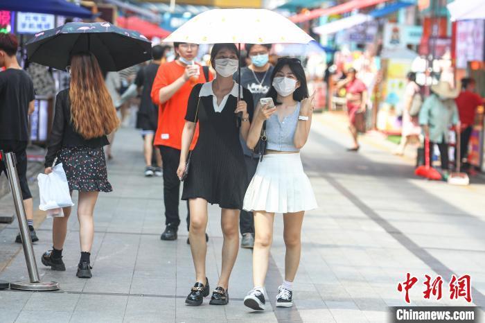 7月7日,在江西南昌萬達(dá)金街,市民撐傘清涼出行。 劉力鑫 攝