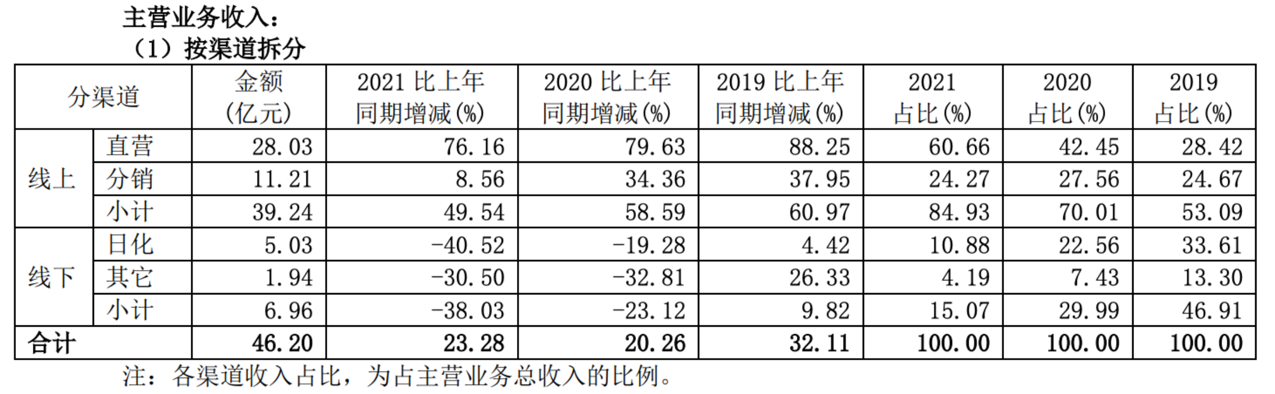 據(jù)悉,珀萊雅自2019年起開始做“大單品策略”,并抓住社交媒體營(yíng)銷、直播帶貨、線上渠道等機(jī)會(huì)盤活了業(yè)務(wù)。自2019年起,其主營(yíng)業(yè)務(wù)收入同比增長(zhǎng)32.11%、20.26%、23.28%。2021年,主營(yíng)業(yè)務(wù)的線上渠道營(yíng)收也在逐年增長(zhǎng),2021年為39.24億元,在總營(yíng)收中占比達(dá)84.93%,同比增長(zhǎng)49.54%。