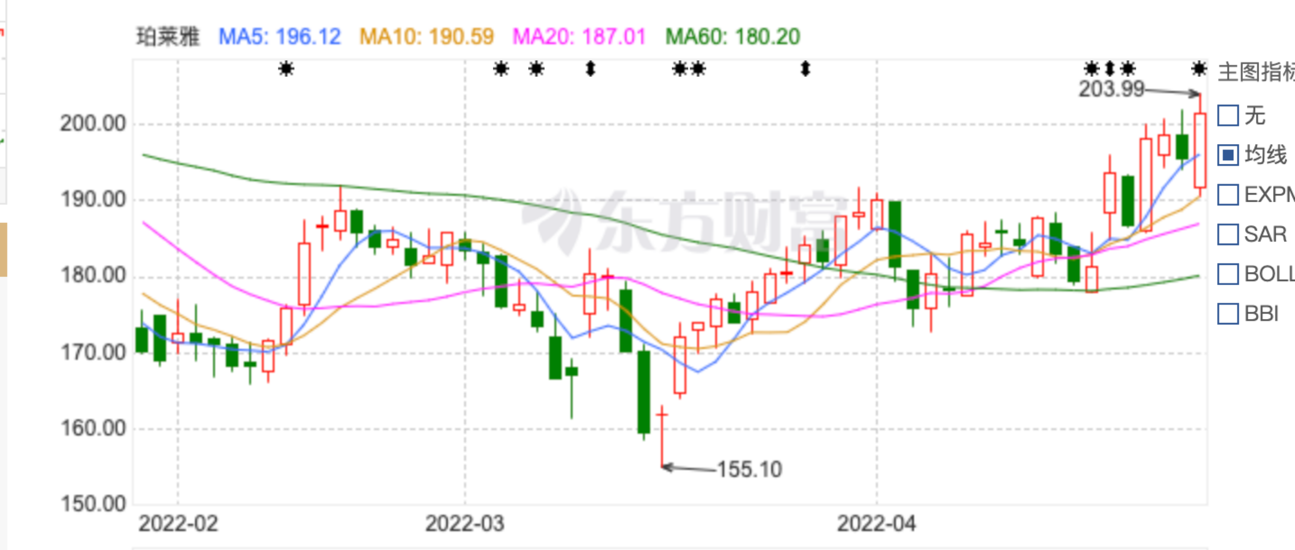 紅星資本局注意到,珀萊雅此前靠“大單品策略”輔以重營(yíng)銷,抓住線上渠道、網(wǎng)紅直播帶貨和社交種草等風(fēng)口,力圖將自己打造成“國(guó)貨之光”。近幾個(gè)月,其在股市的表現(xiàn)可謂良好。在A股持續(xù)震蕩的背景下,珀萊雅股價(jià)卻逆勢(shì)增長(zhǎng),3月15日至4月29日,其股價(jià)上漲26.31%,目前為201.46元/股。