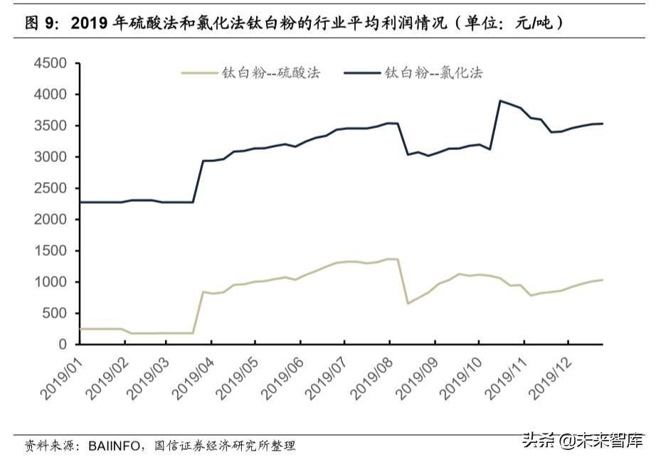 2019 年國(guó)內(nèi)新增產(chǎn)能主要為氯化法,氯化法占比顯著提高。2019 年國(guó)內(nèi)新增 產(chǎn)能主要為龍蟒鈦白的 20 萬噸氯化法和宜賓天原的 5 萬噸產(chǎn)能等,硫酸法基本 無增加,氯化法占比由 2018 年的 10.6%增長(zhǎng)至 2019 年的 16.3%。未來隨著環(huán) 保政策的持續(xù)引導(dǎo),低能耗低污染的氯化法占比將繼續(xù)提升。