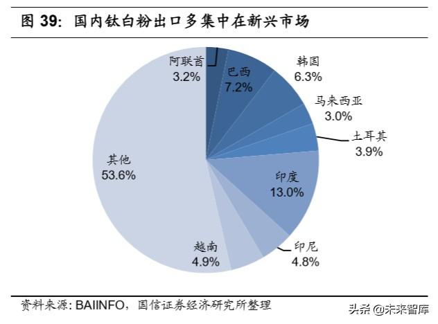 國(guó)內(nèi)鈦白粉價(jià)格優(yōu)勢(shì),出口多以低端硫酸法為主。國(guó)外鈦白粉巨頭多使用 氯化法生產(chǎn)鈦白粉,國(guó)內(nèi)出口的鈦白粉多是硫酸法生產(chǎn)的銳鈦型鈦白粉,售價(jià) 要遠(yuǎn)低于國(guó)外。據(jù) 2019 年 11 月報(bào)價(jià)來看,科慕、特諾和亨斯邁出口到國(guó)內(nèi)的 鈦白粉價(jià)格達(dá)到 24000 元/噸,石原更達(dá)到 26000 元/噸。而中國(guó)攀鋼鈦業(yè)、龍 蟒佰利的金紅石型鈦白粉市場(chǎng)價(jià)格僅為 16500 元/噸左右,價(jià)差達(dá)到每噸 9500 元,其中硫酸法得到的銳鈦型鈦白粉市場(chǎng)價(jià)格更是低可以在 14000 元左右, 價(jià)格優(yōu)勢(shì)顯著。2019 年以來出口增加主要是以降價(jià)換市場(chǎng),國(guó)內(nèi)鈦白粉出口價(jià) 格跌破 2000 美元/噸。依托著巨大的價(jià)格優(yōu)勢(shì),中國(guó)鈦白粉在國(guó)際需求不景氣、 國(guó)外產(chǎn)能收縮的大環(huán)境下,出口迅速增加并擴(kuò)大海外市場(chǎng),后期氯化法產(chǎn)能增 加也會(huì)進(jìn)一步增加國(guó)際競(jìng)爭(zhēng)力。