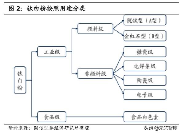 鈦白粉按照用途可以分為顏料級(jí)和非顏料級(jí)兩種。顏料級(jí)鈦白粉以白色顏料為 主要是使用目的,按照結(jié)晶狀態(tài),可進(jìn)一步分為銳鈦型鈦白粉(A 型)和金紅 石型鈦白粉(R 型),其中金紅石型鈦白粉具有更好的化學(xué)穩(wěn)定性,主要用于高 級(jí)室外涂料、光乳膠涂料、高級(jí)紙張和橡膠材料。非顏料級(jí)鈦白粉以純度為主 要目的,分為搪瓷級(jí)、陶瓷級(jí)、電焊級(jí)和電子級(jí)等多種類型,其耐高溫性和光 學(xué)性質(zhì)發(fā)揮主要作用。