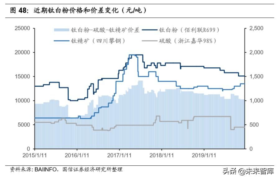 鈦白粉成本價(jià)差有所擴(kuò)大,行業(yè)盈利有所提升。短期來看,進(jìn)入 9 月份以來, 由于硫酸價(jià)格下降,照硫酸法生產(chǎn) 1 噸鈦白粉需要消耗 2.36 噸鈦精礦和 3.9 噸硫酸計(jì)算,鈦白粉價(jià)差較環(huán)比有所上升,高達(dá)到 11432 元/噸,行業(yè)平 均成本也由 15070 元/噸左右降至目前的 13500 元/噸,價(jià)差和毛利同步增長(zhǎng)。 長(zhǎng)期對(duì)比來看,當(dāng)前 11400 元左右的價(jià)差較 2015 年行業(yè)低點(diǎn)時(shí)仍有 2000 元左 右的提升。未來由于硫酸法收到政策限制和氯化法技術(shù)問題導(dǎo)致新增產(chǎn)能難以 大幅上升,所以鈦白粉價(jià)格難以大幅下跌,行業(yè)保持較好盈利確定性較強(qiáng)。