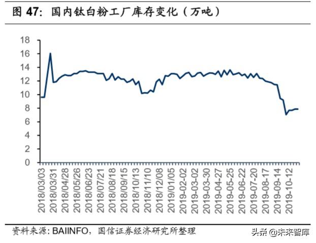 鈦白粉供需平衡,未來價(jià)格穩(wěn)定運(yùn)行。2019 年鈦白粉價(jià)格市場(chǎng)價(jià)格經(jīng)歷了 的起伏,從 2018 年底到 2019 年初的半年時(shí)間里,鈦白粉需求不振,價(jià)格持續(xù)下跌,導(dǎo)致部分廠商開工率較低,庫(kù)存處于歷史低位。從 3 月份開始,企業(yè)訂 單充足,鈦白粉經(jīng)歷了兩次漲價(jià),庫(kù)存已基本為零。進(jìn)入下半年,環(huán)保政策導(dǎo) 致下游企業(yè)開工率下降,鈦白粉需求下滑,進(jìn)入 9 月份,行業(yè)需求旺季導(dǎo)致企 業(yè)訂單量增加,但并未導(dǎo)致加以價(jià)格上漲。目前鈦白粉供需處于相對(duì)平衡狀態(tài), 上游原材料漲價(jià)與下游需求淡季相互制衡,未來價(jià)格走勢(shì)較為平穩(wěn)。