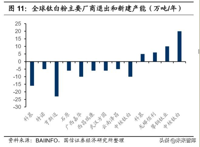 從行業(yè)結(jié)構(gòu)性調(diào)整角度來看,我國(guó)鈦白粉行業(yè)產(chǎn)能結(jié)構(gòu)性過剩,低端硫酸法產(chǎn) 品過剩,高端氯化法產(chǎn)品稀缺,政策從去產(chǎn)能和環(huán)?;瘍蓚€(gè)角度進(jìn)行引導(dǎo) 產(chǎn)業(yè)升級(jí),從 2015 年開始,國(guó)內(nèi)鈦白粉產(chǎn)能增速緩慢,一方面由于落后高污 染產(chǎn)能的去除,另一方面是因?yàn)楦叨寺然夹g(shù)國(guó)內(nèi)僅有少數(shù)幾個(gè)大廠掌握。 氯化法生產(chǎn)鈦白粉具有能耗低,污染小和質(zhì)量好的有點(diǎn),從國(guó)外大廠來看,氯 化法占比已經(jīng)超過 80%,國(guó)內(nèi)氯化法占比也逐漸提升,基本貢獻(xiàn)國(guó)內(nèi)全部新增 產(chǎn)能。當(dāng)前國(guó)內(nèi)氯化法技術(shù)基本突破,商業(yè)化擴(kuò)產(chǎn)達(dá)到增速拐點(diǎn),未來國(guó)內(nèi)氯 化法將成為行業(yè)大趨勢(shì)。