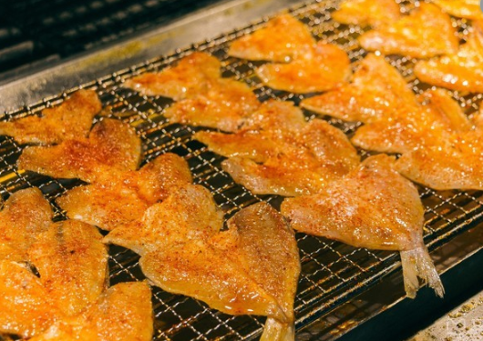 超特別的烤魚,大家都知道一般的烤魚都是用火來烤的,這里卻是用油來炸的,肉底下都會墊一層油炸薄荷,所以跟肉一起吃下去肥而不膩,瘦而不柴,口感松脆中帶點(diǎn)QQ的彈性。蘸著辣子吃更有味道