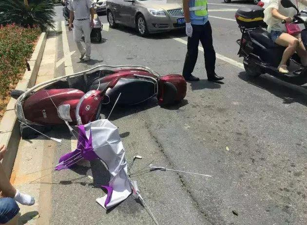 廣東廉江市安鋪鎮(zhèn)安順路,一女子騎著摩托車在路上行駛,可能車速較快加上風(fēng)力較大,其車上的遮陽棚被風(fēng)攔腰折斷,女子連人帶車摔倒。更不幸的是折斷的傘柄直插其喉嚨,造成大量出血。