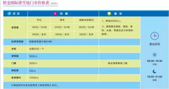 套票不含:雪服出租30元/套;雪服含雪具租用押金300元/套;存衣柜租金10元/個(gè),押金20元;教練費(fèi)用等。