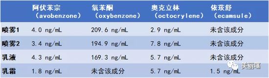 四款產(chǎn)品使用一周內(nèi),各成分在受試者體內(nèi)的大血漿濃度如下表。