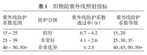 UVR防護(hù)織物 :紫外線防護(hù)系數(shù)(UPF)用于評(píng)價(jià)織物對(duì) UVR的防護(hù)性能,當(dāng)UPF值 > 40,且UVA 的透過(guò)率<5%時(shí),可稱(chēng)為“防紫外線照射產(chǎn)品” 。