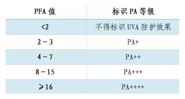 UVA防曬系數(shù)(PFA):是評(píng)價(jià)防曬化妝品對(duì)皮膚曬黑的防護(hù)指標(biāo),PA等級(jí)越高,防止皮膚曬黑效果越好。