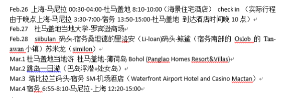 2015.2.26號(hào)凌晨0:30的Z2019亞航飛機(jī),于是25號(hào)晚和老媽坐2號(hào)線到機(jī)場,九點(diǎn)差不多就到了。10點(diǎn)15亞航才開始值機(jī)??墒牵墒?,可是!!竟然說飛機(jī)要晚點(diǎn)三個(gè)小時(shí)!!原因是香港上空限流,導(dǎo)致來接我們的飛機(jī)晚從馬尼拉出發(fā)三小時(shí)。但是我們后面8點(diǎn)10分有菲航飛杜馬的飛機(jī)?。?!無奈三點(diǎn)半上海起飛后,快七點(diǎn)才到達(dá)馬尼拉。雖然有亞航給的延誤證明,但是不同的航空公司溝通環(huán)節(jié)有問題只好自己負(fù)責(zé),一班機(jī)票報(bào)廢。只能臨時(shí)買票,又貴又容易買不到!終只能買到馬尼拉飛宿務(wù)的宿務(wù)航空機(jī)票!導(dǎo)致了一天的奔波。另外這班飛機(jī)真的抖,,一度嚇得睡不著。。。不過亞航空姐都蠻漂亮的