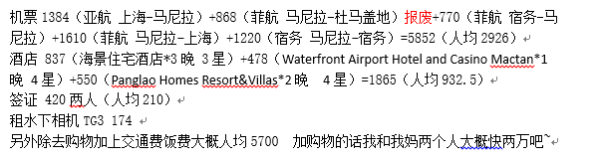 首先介紹大致一些情況~出行前直接在中國銀行換的比索,其實(shí)先換美金合算點(diǎn),但是懶得倒騰了~機(jī)票的話都是去哪兒網(wǎng)或者官網(wǎng)訂的!簽證就找某寶吧!便宜又快捷。租水下相機(jī)很必要,TG3色彩很好不過像素一般,水下20米可用,下面會(huì)有圖。在菲國不會(huì)英語還是比較。??膳?,稍微會(huì)一點(diǎn)比劃比劃也可以吧。。。菲人英語口音都很重,都會(huì)英語和菲律賓語。菲國也是小費(fèi),服務(wù)性人員(massage按摩,餐廳)50P為宜,普通TUTU多給個(gè)10P,20P唄,飯店加收服務(wù)費(fèi)的話就不用給小費(fèi)了。TUTU是可以給硬幣,其他小費(fèi)請給紙幣表示尊敬。