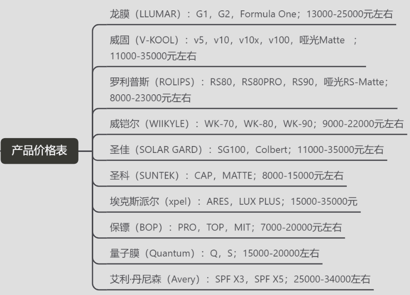 從市場(chǎng)價(jià)上看排行(代表產(chǎn)品)龍膜(LLUMAR):G1,G2,F(xiàn)ormulaOne;13000-25000元左右