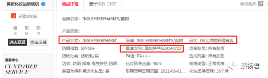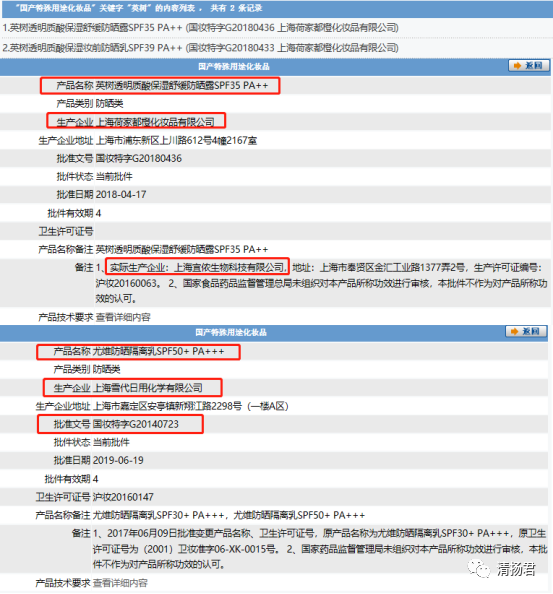 英樹天貓旗艦店顯示,該產(chǎn)品的批準(zhǔn)文號(hào)為:國妝特字G20140723。而經(jīng)查詢,英樹品牌的特殊用途化妝品只有兩款,分別是下圖的“英樹透明質(zhì)酸保濕舒緩防曬露SPF35 PA++”和“英樹透明質(zhì)酸保濕妝前防曬乳SPF39 PA++ ”。而國妝特字G20140723對(duì)應(yīng)的產(chǎn)品是“尤維防曬隔離乳 SPF50+ PA+++”,是上海雪代日用化學(xué)有限公司獨(dú)自申請(qǐng)的特殊用途化妝品生產(chǎn)許可證。