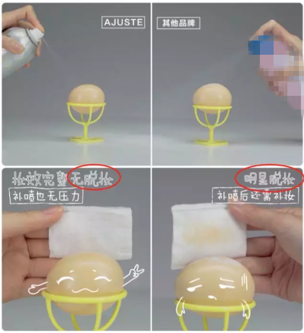 左邊噴完Ajuste防曬噴霧后,速干,擦拭不脫妝;右邊是普通防曬噴霧,看起來已經干了,擦拭后掉妝了