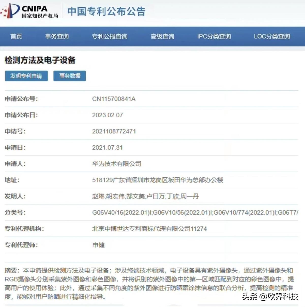 從該博主發(fā)出的圖片可知,知識(shí)產(chǎn)權(quán)局官網(wǎng)顯示華為該項(xiàng)專(zhuān)利的名稱(chēng)為“檢測(cè)方法及電子設(shè)備”,摘要顯示,該專(zhuān)利將應(yīng)用于華為的新手機(jī)之上,新手機(jī)將配備紫外攝像頭,通過(guò)紫外攝像頭和RGB攝像頭可以采集用戶臉部的紫外圖像和彩色圖像,然后將獲得的紫外圖像與彩色圖像進(jìn)行相匹配,從而提升用戶的用機(jī)體驗(yàn)。值得一提的是,采集紫外圖像還可以從多角度來(lái)進(jìn)行,從而獲得更加的用戶臉部紫外圖像,再結(jié)合防曬霜的涂抹位置來(lái)對(duì)用戶涂抹防曬霜進(jìn)行指導(dǎo)。