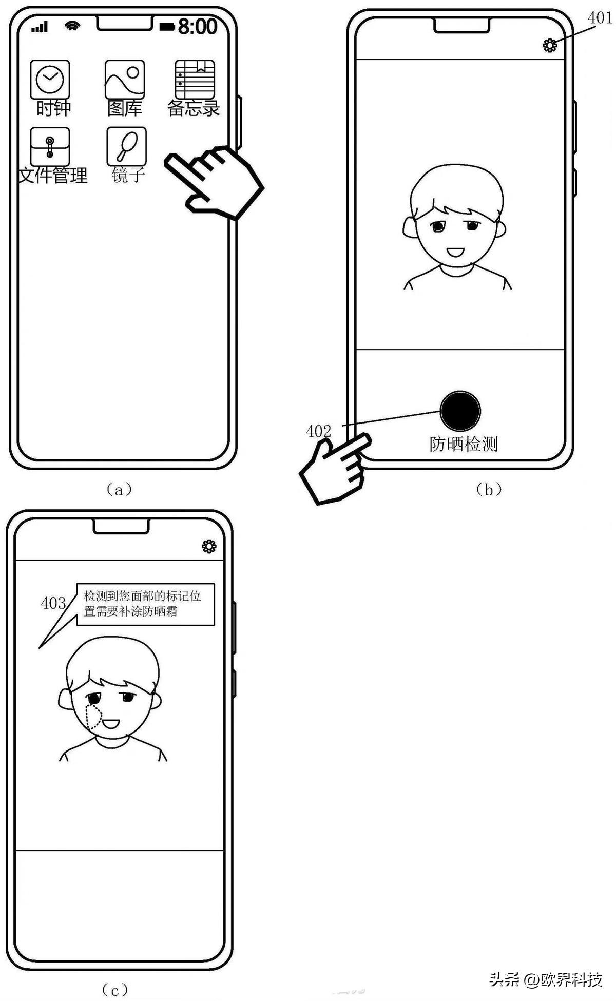 也就是說(shuō)。華為的這項(xiàng)新專(zhuān)利可以通過(guò)紫外攝像頭和RGB攝像頭來(lái)采集紫外圖像以及彩色圖像,采集完畢匹配到相應(yīng)的彩色圖像中,以此來(lái)檢測(cè)用戶面部需要補(bǔ)涂防曬霜的區(qū)域,并且還能將該區(qū)域具體化。不僅如此,該項(xiàng)專(zhuān)利還可以提醒用戶注意防曬。