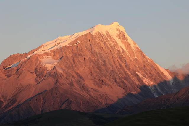 高原上的日夜溫差較大,太陽完全落下山去,溫度也快速下降。站在村子里,就能望見格聶神山的其中一座山峰。