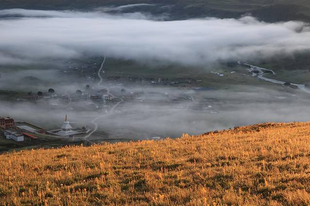 高原的日出,和我從小生活的四川村落不一樣,日出之前的薄霧,在日出之后越來越濃厚,將村莊緊緊包裹在霧海之中,直到9、10點左右才漸漸散去。