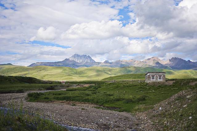 行車到河谷中,泥巴路也變成順暢的水泥路,心情也隨著迎面而來的風而舒暢起來,迎著溪水,陽光,柔風,以及就在不遠處的格聶神山。